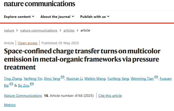 【供稿:物理学院】近日,手机版伟德app客户端下载安装官网最新版苹果物理学院高压与超硬材料全国重点实验室/综合极端条件高压科学中心邹勃教授团队杨新一教授课题组与中科院大连化学物理研究所田文明教授、手机版伟德app客户端下载安装官网最新版苹果化学学院白福全教授等人合作,在金属-有机框架(MOFs)材料的多色可调荧光/磷光领域取得重要突破。通过压强工程调控镉基金属-有机框架(MOFs)材料的电荷转移动力学,实现单组份MOFs材料Cd(BDC)(DMF)的高效多色可调荧光/磷光发射。相关成果以“Space-Confined Charge Transfer Turns on Multicolor Emission in Metal-Organic Frameworks via Pressure Treatment”为题发表在《Nature Communications》(Nat. Commun. 2025, 16, 4166)上。