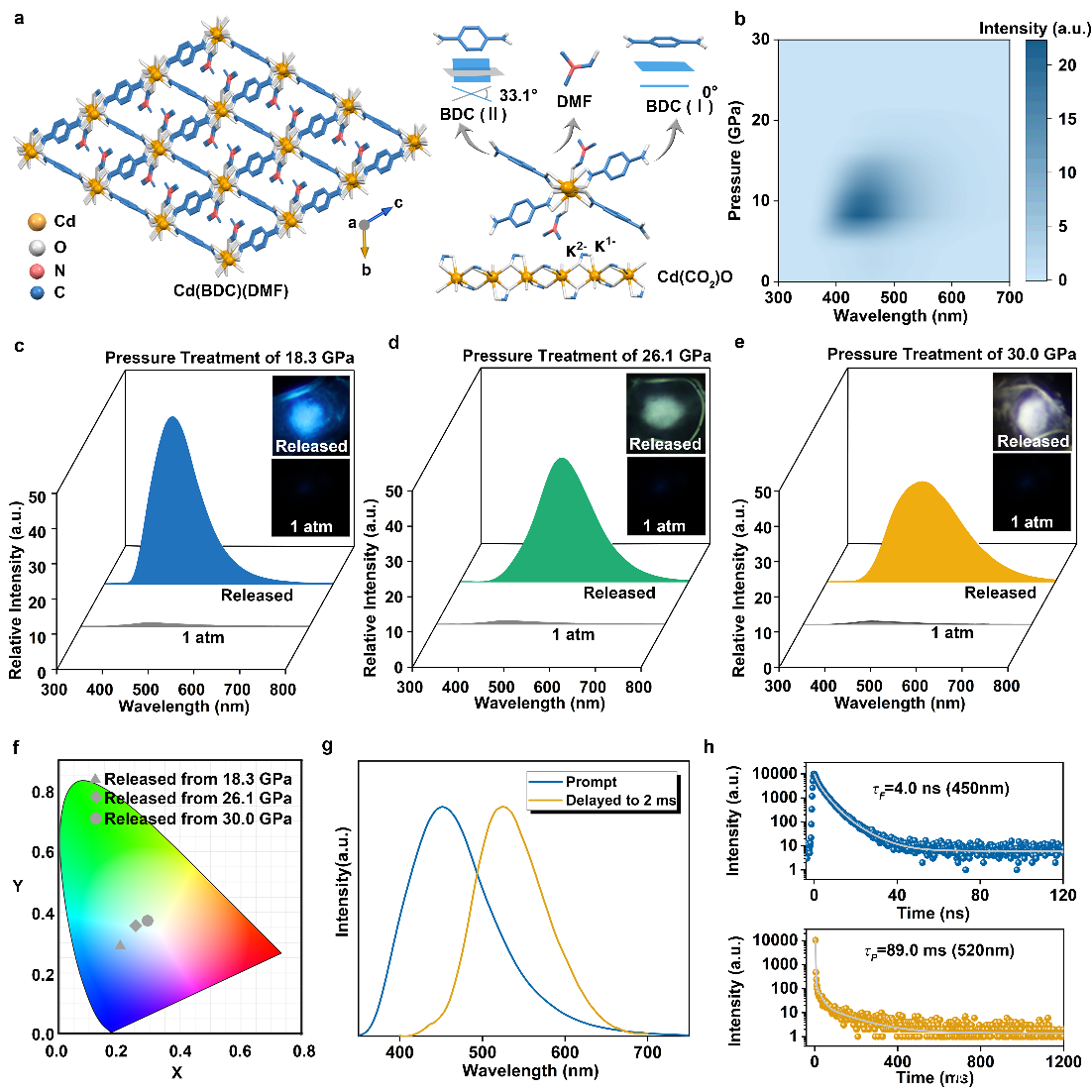 图:通过压强处理工程开启Cd(BDC)(DMF)的高效多色可调荧光/磷光发射。